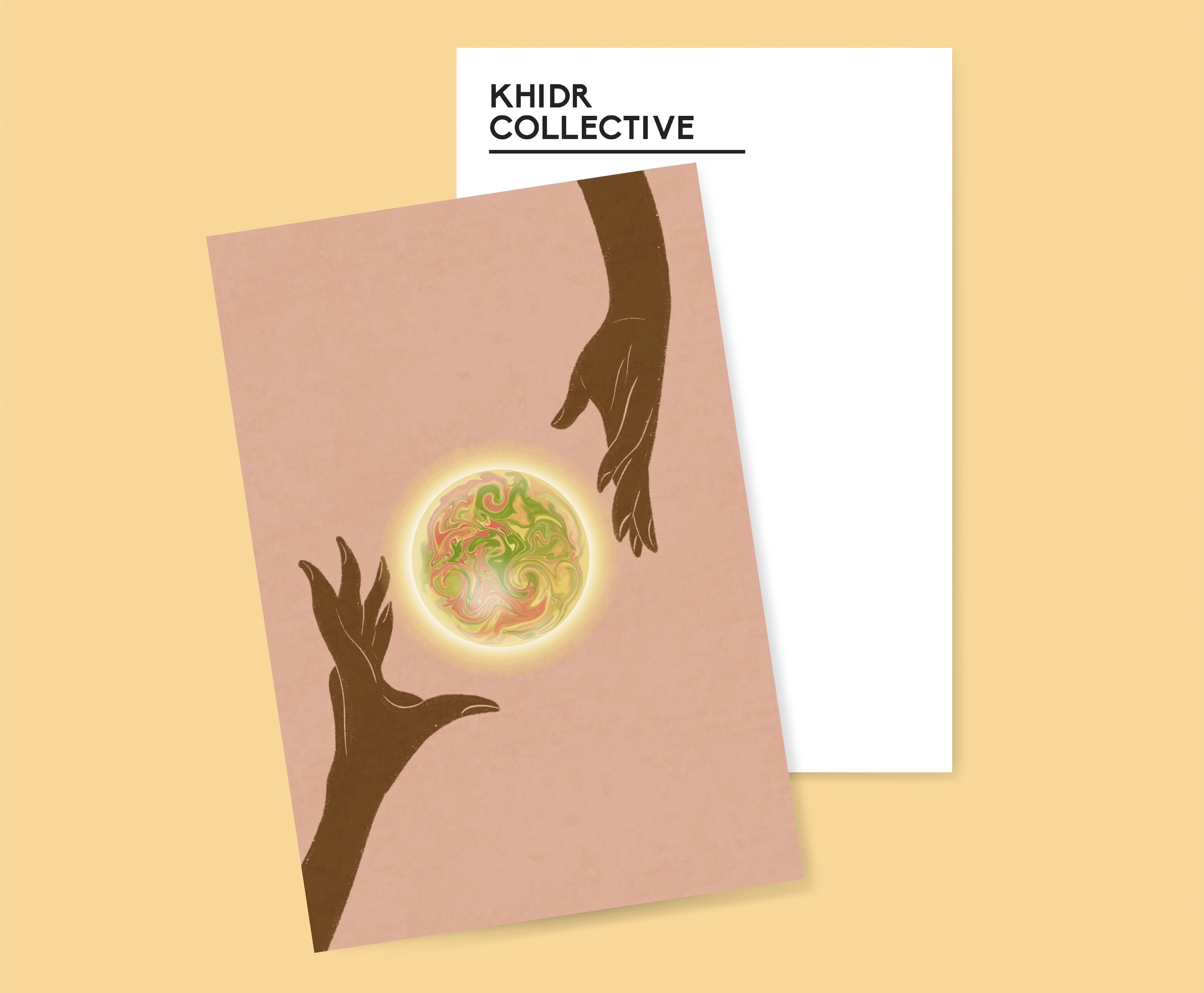 A6 standard size postcard with an illustration from the inside pages of Khidr Collective Zine, Issue Five